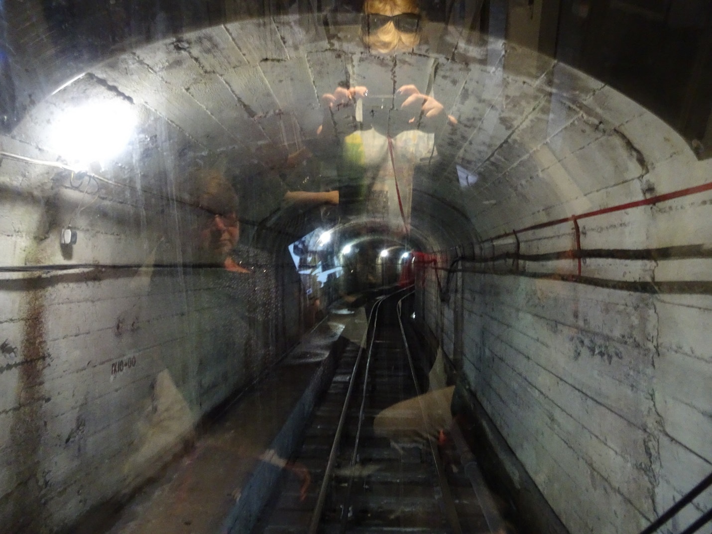 Следующий день был весь посвящен святыням Нового Афона, как православным, так и историческим. Гигантская пещера тоже не была обойдена вниманием. Туда доставляет поезд метро. Туннель метро Новоафонской пещеры из окна первого вагона поезда. Мы в отражении.